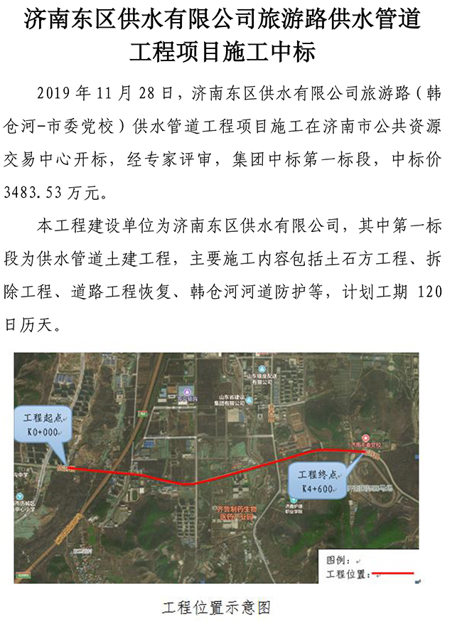 濟南東區供水有限公司旅游路供水管道工程項目施工中標